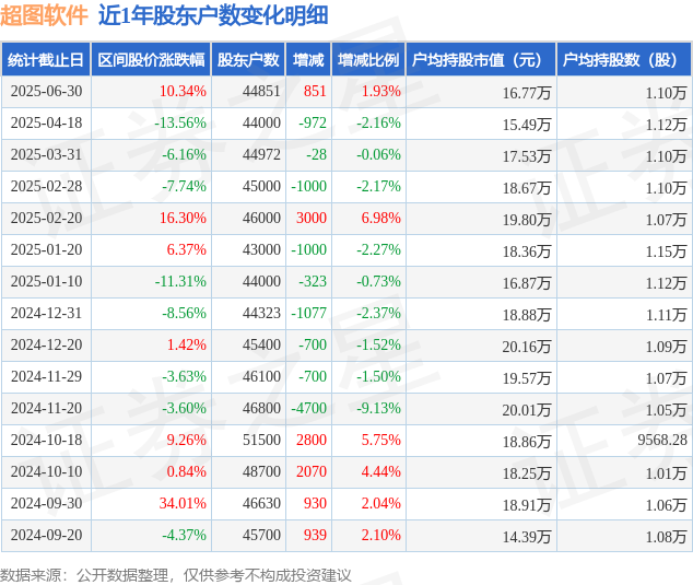 从股价来看,2025年4月18日至2025年6月30日,超图软件区间涨幅为10.34%,在此期间股东户数增加851.0户,增幅为1.93%。